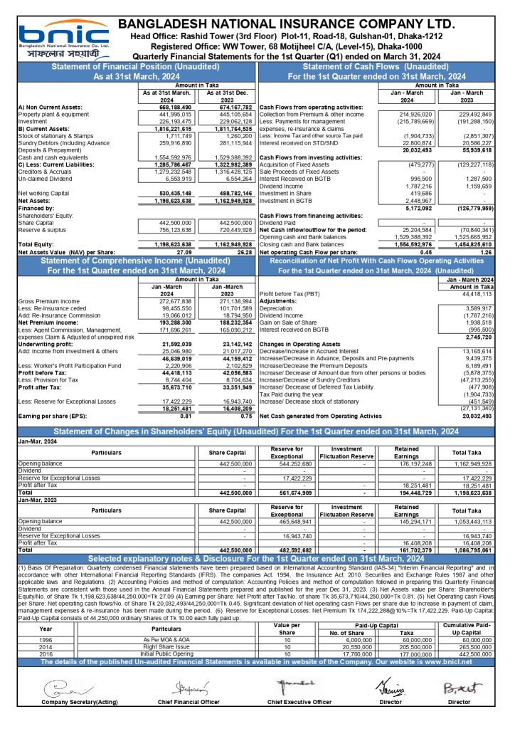 বাংলাদেশ ন্যাশনাল ইন্স্যুরেন্সের আর্থিক প্রতিবেদন প্রকাশ