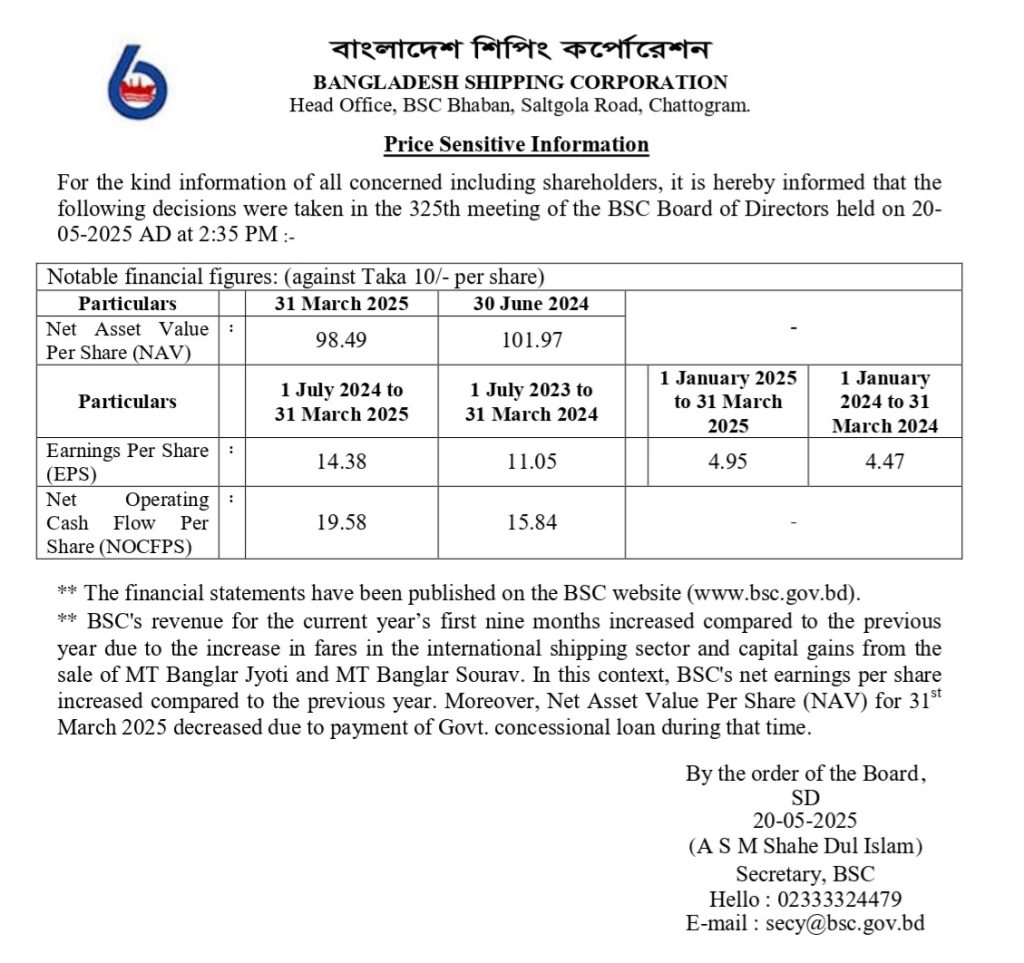 আসন্ন বোর্ড সভায় ঢাকা স্টক এক্সচেঞ্জের (ডিএসই) লিস্টিং রেগুলেশন ২০১৫ এর ১৯(১) অনুযায়ী ৩১ ডিসেম্বর শেষ হওয়া ২০২৪ সালের নিরীক্ষিত আর্থিক প্রতিবেদন পর্যালোচনা করা হবে।