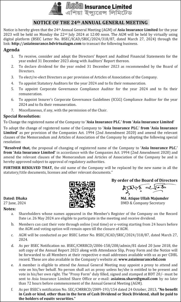 Notice of the 24th Annual General Meeting of Asia Insurance Limited. Posted on June 27, 2024July 30, 2024 by kazi Arifur Rahman