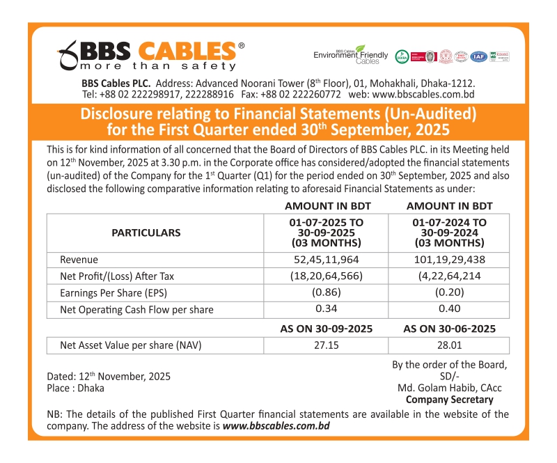 Price Sensitive Information Of BBS Cables Limited. Posted on November 12, 2025November 13, 2025 by kazi Arifur Rahman
