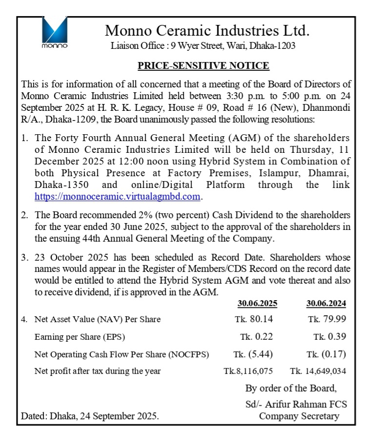 Price Sensitive Information of Monno Ceramic Industries Limited. Posted on September 24, 2025September 30, 2025 by kazi Arifur Rahman