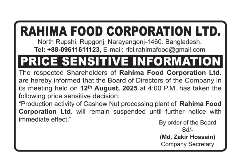 Price Sensitive Information of Rahima Food Corporation Ltd. Posted on August 12, 2025September 30, 2025 by kazi Arifur Rahman